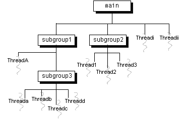 ThreadGroups can contain not only threads but also other ThreadGroups. The top-most thread group in a Java application is the thread group named main. You can create threads and thread groups in the main group. You can also create threads and thread groups in subgroups of main. The result is a root-like hierarchy of threads and thread groups: