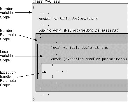 countChars,countis a local variable. The scope ofcount, that is, the code that can accesscount, extends from the declaration ofcountto the end of thecountCharsmethod (indicated by the first right curly bracket}that appears in the program code). In general, a local variable is accessible from its declaration to the end of the code block in which it was declared.Method parameters are formal arguments to methods and constructors and are used to pass values into methods. The discussion about writing methods in the next lesson, Implementing Methods
