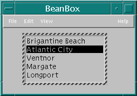 OurListBoxdemo Bean illustrates how to use an indexed property. OurListBox extends theListclass to provide a Bean that presents the user a list of choices: Choices that you can provide and change at design time. Here's an illustration of anOurListBoxinstance:OurListBoxexposes theitemindexed property with the following accessor methods:public void setItems(String[] indexprop) { String[] oldValue=fieldIndexprop; fieldIndexprop=indexprop; populateListBox(); support.firePropertyChange("items",oldValue, indexprop); } public void setItems(int index, String indexprop) { String[] oldValue=fieldIndexprop; fieldIndexprop[index]=indexprop; populateListBox(); support.firePropertyChange("Items",oldValue, fieldIndexprop); } public String[] getItems() { return fieldIndexprop; } public String getItems(int index) { return getItems()[index]; }When an item is set by one of the