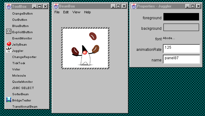 beans/jarsdirectory. Move your JAR files into that directory to have them automatically loaded at BeanBox startup. Load Beans from JAR files located elsewhere by using the File|LoadJar... BeanBox menu item. Clicking on a Bean name within the ToolBox chooses that Bean for placement within the BeanBox. You will see the cursor change to a crosshair.Dropping a Bean on the BeanBox