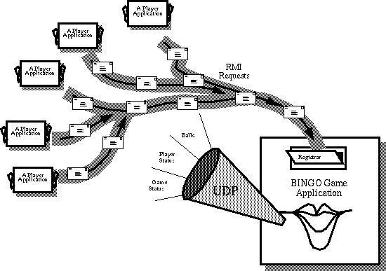 At the heart of BINGO is the communication between the Game application and the Player applications.As you can see from the diagram, the Game and the Players have two different forms of communication and use two different mechanisms for them. First, the Game broadcasts status information to all the Players over UDP. Second, the Player makes individual requests of the Game via RMI.