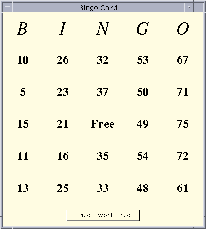 To play BINGO, a Game application must be running somewhere on your network and you must run the Player application. Any number of Player applications can play against each other using the same Game application. So if you run the Game application on your machine, you can invite your friends to play with you. If you are playing against a Game running on someone else's machine you can skip steps 1 and 2.Both the Game and the Player use the JFC components in the "Swing" release. Follow the steps outlined in Getting Started with Swing