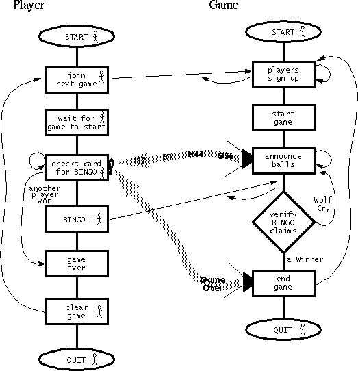 Here's a chart that describes the flow of the BINGO game.The flow chart leaves out some details but basically the flow of the game is as follows: