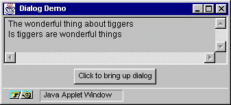 Note: Because some old browsers don't support 1.1, the above applet is a 1.0 version (here is the 1.0 code; here's the 1.1 code). To run the 1.1 version of the applet, go toexample-1dot1/DialogWindow.html.Dialogs can be modal. Modal dialogs require the user's attention, preventing the user from doing anything else in the dialog's application until the dialog has been dismissed. By default, dialogs are non-modal -- the user can keep them up and still work in other windows of the application.