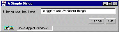Here's the code for the window that the above applet brings up. This code can be run as a standalone application or, with the help of the AppletButton class, as an applet (as above). Here's just the code that implements the Dialog object: