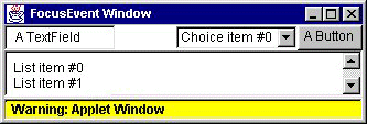 The following applet demonstrates focus events. By clicking the top button in the applet, you can bring up a window that contains a variety of components. A focus listener listens for focus events on each component in the window, including the window itself (which is an instance of aFramesubclass calledFocusWindow).