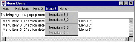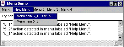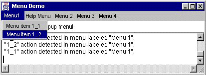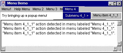 public class MenuWindow extends Frame { . . . public MenuWindow() { MenuBar mb; Menu m1, m2, m3, m4, m4_1, m5; MenuItem mi1_1, mi1_2, mi3_1, mi3_2, mi3_3, mi3_4, mi4_1_1, mi5_1, mi5_2; CheckboxMenuItem mi2_1; ...//Add the output displayer to this window... //Build the menu bar. mb = new MenuBar(); setMenuBar(mb); //Build first menu in the menu bar. //Specifying the second argument as true //makes this a tear-off menu. m1 = new Menu("Menu 1", true); mb.add(m1); mi1_1 = new MenuItem("Menu Item 1_1"); m1.add(mi1_1); mi1_2 = new MenuItem("Menu Item 1_2"); m1.add(mi1_2); //Build help menu. m5 = new Menu("Menu 5"); mb.add(m5); //just setting the help menu doesn't work; must add it mb.setHelpMenu(m5); mi5_1 = new MenuItem("Menu Item 5_1"); m5.add(mi5_1); mi5_2 = new MenuItem("Menu Item 5_2"); m5.add(mi5_2); //Build second menu in the menu bar. m2 = new Menu("Menu 2"); mb.add(m2); mi2_1 = new CheckboxMenuItem("Menu Item 2_1"); m2.add(mi2_1); //Build third menu in the menu bar. m3 = new Menu("Menu 3"); mb.add(m3); mi3_1 = new MenuItem("Menu Item 3_1"); m3.add(mi3_1); mi3_2 = new MenuItem("Menu Item 3_2"); m3.add(mi3_2); m3.addSeparator(); mi3_3 = new MenuItem("Menu Item 3_3"); m3.add(mi3_3); mi3_4 = new MenuItem("Menu Item 3_4"); mi3_4.disable(); m3.add(mi3_4); //Build fourth menu in the menu bar. m4 = new Menu("Menu 4"); mb.add(m4); m4_1 = new Menu("Submenu 4_1"); m4.add(m4_1); mi4_1_1 = new MenuItem("Menu Item 4_1_1"); m4_1.add(mi4_1_1); } . . . public boolean action(Event event, Object arg) { String str = "Action detected"; if (event.target instanceof MenuItem) { MenuItem mi=(MenuItem)(event.target); str += " on " + arg; if (mi instanceof CheckboxMenuItem) { str += " (state is " + ((CheckboxMenuItem)mi).getState() + ")"; } MenuContainer parent = mi.getParent(); if (parent instanceof Menu) { str += " in " + ((Menu)parent).getLabel(); } else { str += " in a container that isn't a Menu"; } } str += ".\n"; ...//Display the string in the output area... return false; }
