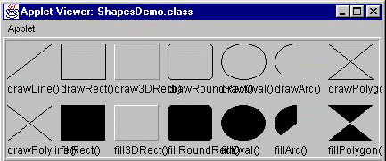 Note: Because some old browsers don't support 1.1, the above applet is a 1.0 version (here is the 1.0 code; here's the 1.1 code). To run the 1.1 version of the applet, go toexample-1dot1/ShapesDemo.html.insets()method to protect its boundaries, text might be drawn on top of the frame around the applet. The next page improves on this example, teaching you how to make sure text fits within a given space.Here's just the code that draws the geometric shapes. The