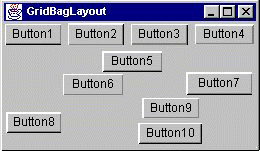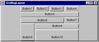 protected void makebutton(String name, GridBagLayout gridbag, GridBagConstraints c) { Button button = new Button(name); gridbag.setConstraints(button, c); add(button); } public GridBagWindow() { GridBagLayout gridbag = new GridBagLayout(); GridBagConstraints c = new GridBagConstraints(); setFont(new Font("Helvetica", Font.PLAIN, 14)); setLayout(gridbag); c.fill = GridBagConstraints.BOTH; c.weightx = 1.0; makebutton("Button1", gridbag, c); makebutton("Button2", gridbag, c); makebutton("Button3", gridbag, c); c.gridwidth = GridBagConstraints.REMAINDER; //end of row makebutton("Button4", gridbag, c); c.weightx = 0.0; //reset to the default makebutton("Button5", gridbag, c); //another row c.gridwidth = GridBagConstraints.RELATIVE; //next to last in row makebutton("Button6", gridbag, c); c.gridwidth = GridBagConstraints.REMAINDER; //end of row makebutton("Button7", gridbag, c); c.gridwidth = 1; //reset to the default c.gridheight = 2; c.weighty = 1.0; makebutton("Button8", gridbag, c); c.weighty = 0.0; //reset to the default c.gridwidth = GridBagConstraints.REMAINDER; //end of row c.gridheight = 1; //reset to the default makebutton("Button9", gridbag, c); makebutton("Button10", gridbag, c); }This example uses one GridBagConstraints instance for all the components the GridBagLayout manages. Just before each component is added to the container, the code sets (or resets to default values) the appropriate instance variables in the GridBagConstraints object. It then uses the