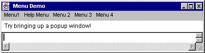 Implementation Note: The applet is implemented as a button that brings up the window showing the components. The window is necessary because the program includes a menu, and menus can be used only in windows. The program has a main() method so it can run as an application. The AppletButton class provides an applet framework for the window. AppletButton is a highly configurable applet that's discussed on the following pages: Deciding Which Parameters to Support(in the Writing Applets trail) and Writing the Code to Support Parameters(in the Writing Applets trail).