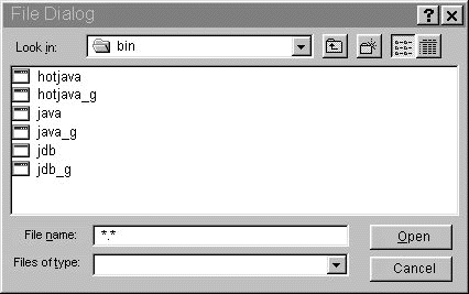 Here is a picture of the FileDialog window that the Solaris Applet Viewer brings up: