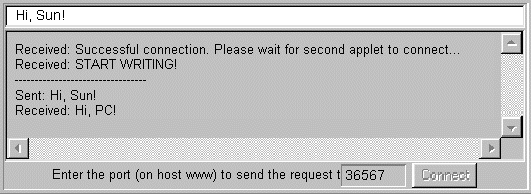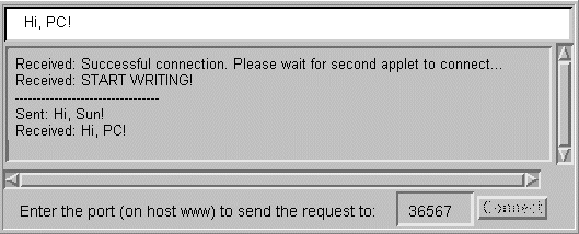 The instructions for running the server are just like those for the previous example. Run the server on the applets' originating host, recording the port number the applets should rendezvous on. then initialize both applets (which can be running on different machines) to talk to the server port number. After this initialization is complete, type into each applet and press the Return key to send the message to the other applet.