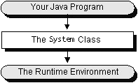 Systemclass. However, in rare cases, a program might have to access the system through theRuntimeobject that represents the current runtime environment. The last section of this lesson, TheRuntimeObject explains how to do this and talks about the trade-offs of accessing the system directly via the Runtime object.The following diagram shows that the