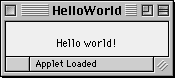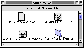 Although you can view your applets using a Web browser, you may find it easier to test your applets using the simple Applet Runner application that comes with the JavaTM Platform. To view the HelloWorld applet using Applet Runner, Open the folder Apple Applet Runner in the MRJ SDK 2.2 folder. There should be an application called Apple Applet Runner.