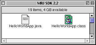 HelloWorldApp.classfile in the MRJ SDK 2.2 folder on top of the JBindery icon.