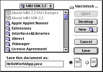 HelloWorldApp.java.When you're finished, the dialog box should look like this:Now click Save, and exit SimpleText.