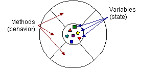 The object diagrams show that the object's variables make up the center, or nucleus, of the object. Methods surround and hide the object's nucleus from other objects in the program. Packaging an object's variables within the protective custody of its methods is called encapsulation