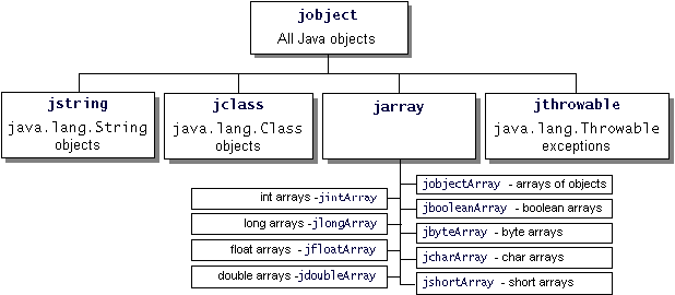 Java objects are passed by reference. All references to Java objects have the type jobject. For convenience and to avoid programming errors, the JNI implements a set of types that are conceptually all subclassed from (or are "subtypes" of) jobject, as follows: