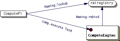 Computeobject never needsPi's class definition until aPiobject is passed in as an argument to theexecuteTaskmethod. At that point the code for the class is loaded by RMI into theComputeobject's virtual machine, theexecutemethod is called, and the task's code is executed. The resultingObject, which in the case of thePitask is ajava.math.BigDecimalobject, is handed back to the calling client, where it is used to print out the result of the calculation.The fact that the supplied