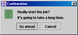 If the user chooses the Go ahead button, the Start button should do exactly what it did in SwingApp2. If the user does anything else, the application should update the label to report the cancellation and leave the buttons in their existing state.
